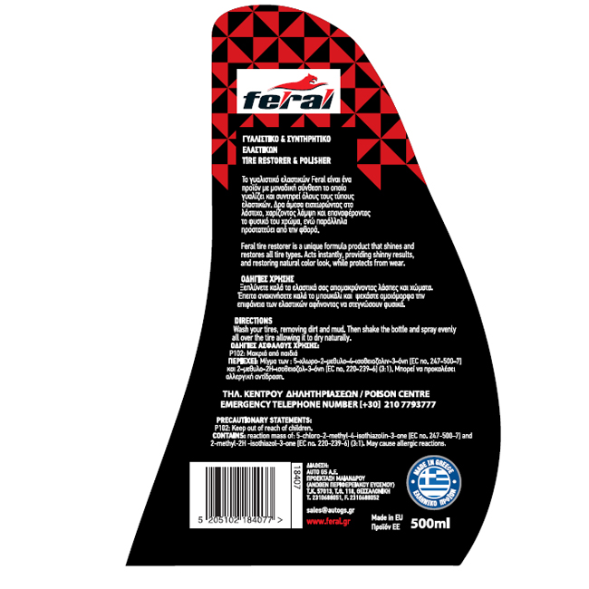 Το γυαλιστικό ελαστικών Feral είναι ένα προϊόν με μοναδική σύνθεση, το οποίο γυαλίζει και συντηρεί όλους τους τύπους των ελαστικών. Δρα άμεσα εισχωρώντας στο λάστιχο, χαρίζοντας λάμψη και επαναφέροντας το φυσικό τους χρώμα, ενώ παράλληλα προστατεύει από την φθορά και αποτρέπει τα σκασίματα.