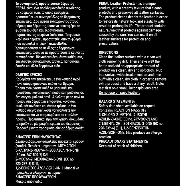Το γαλάκτωμα δέρματος FERAL είναι ένα προϊόν μοναδικής σύνθεσης, με κρεμώδη υφή, το οποίο καθαρίζει, προστατεύει και συντηρεί όλες τις δερμάτινες επιφάνειες. Δρα άμεσα εισχωρώντας στους πόρους του δέρματος, ώστε να επαναφέρει τη φυσική του όψη και ελαστικότητα, παρατείνοντας το χρόνο ζωής του. Το φυσικό κερί που περιέχει, προστατεύει από τη φθορά που προκαλεί η ηλιακή ακτινοβολία.
